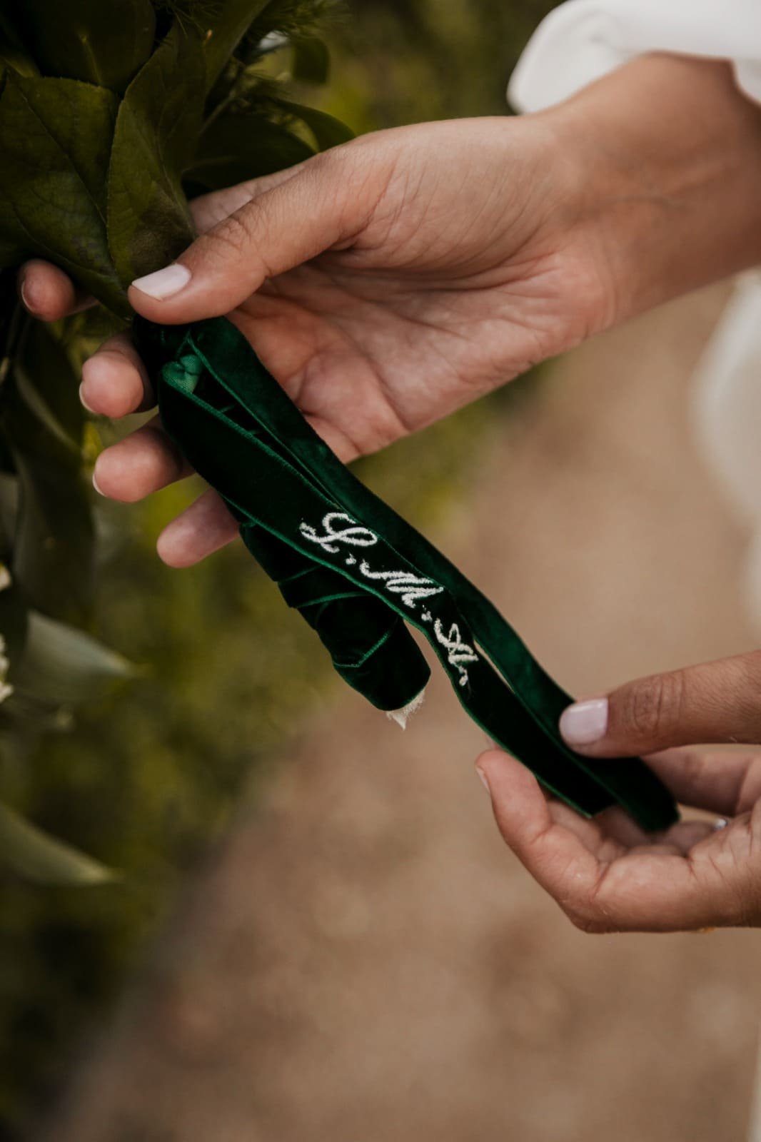 Puedes elegir el color del lazo para tu ramo, así como la medida. Sólo debes de indicarnoslo. Además, el terciopelo puede combinarse con el lazo de los saquitos de alianzas, de novios… Puedes bordar tu fecha, por una frase especial .. ¡lo que tú quieras!