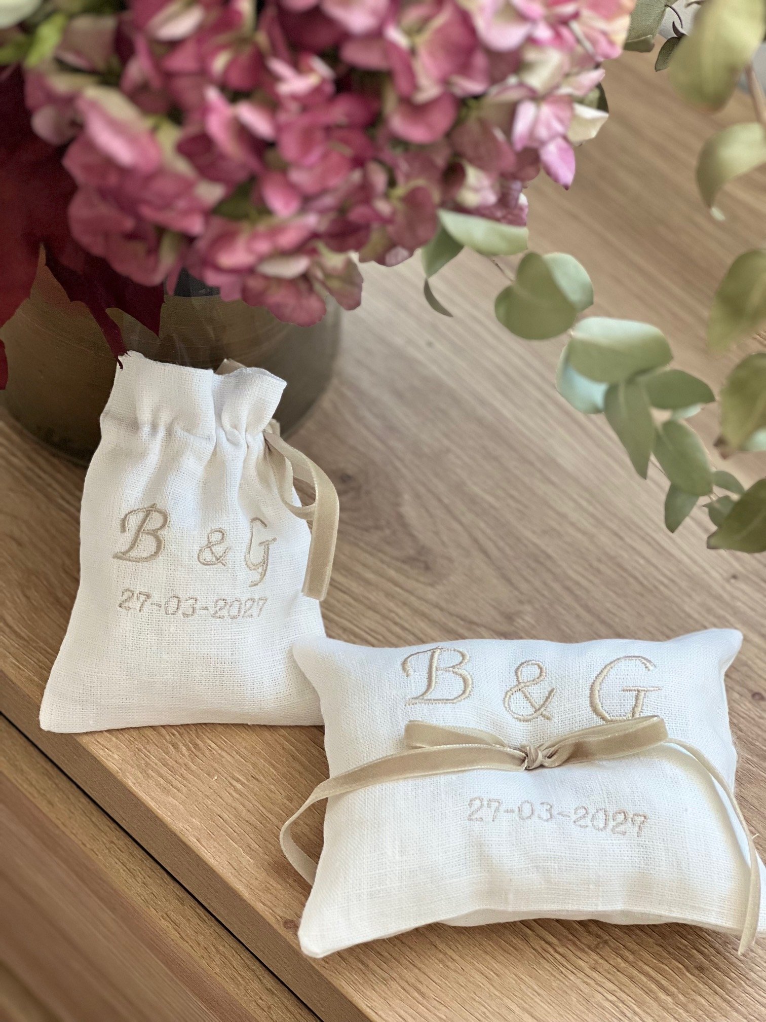 Descubre este elegante pack de ceremonia, pensado para acompañar uno de los momentos más especiales de tu boda. Incluye un cojín de alianzas de terciopelo burdeos y un delicado saquito bordado para arras, logrando una combinación perfecta entre tradición y sofisticación. Cada pieza está hecha a mano, cuidando cada detalle para aportar armonía, estilo y significado al intercambio de votos y a la entrega de arras.