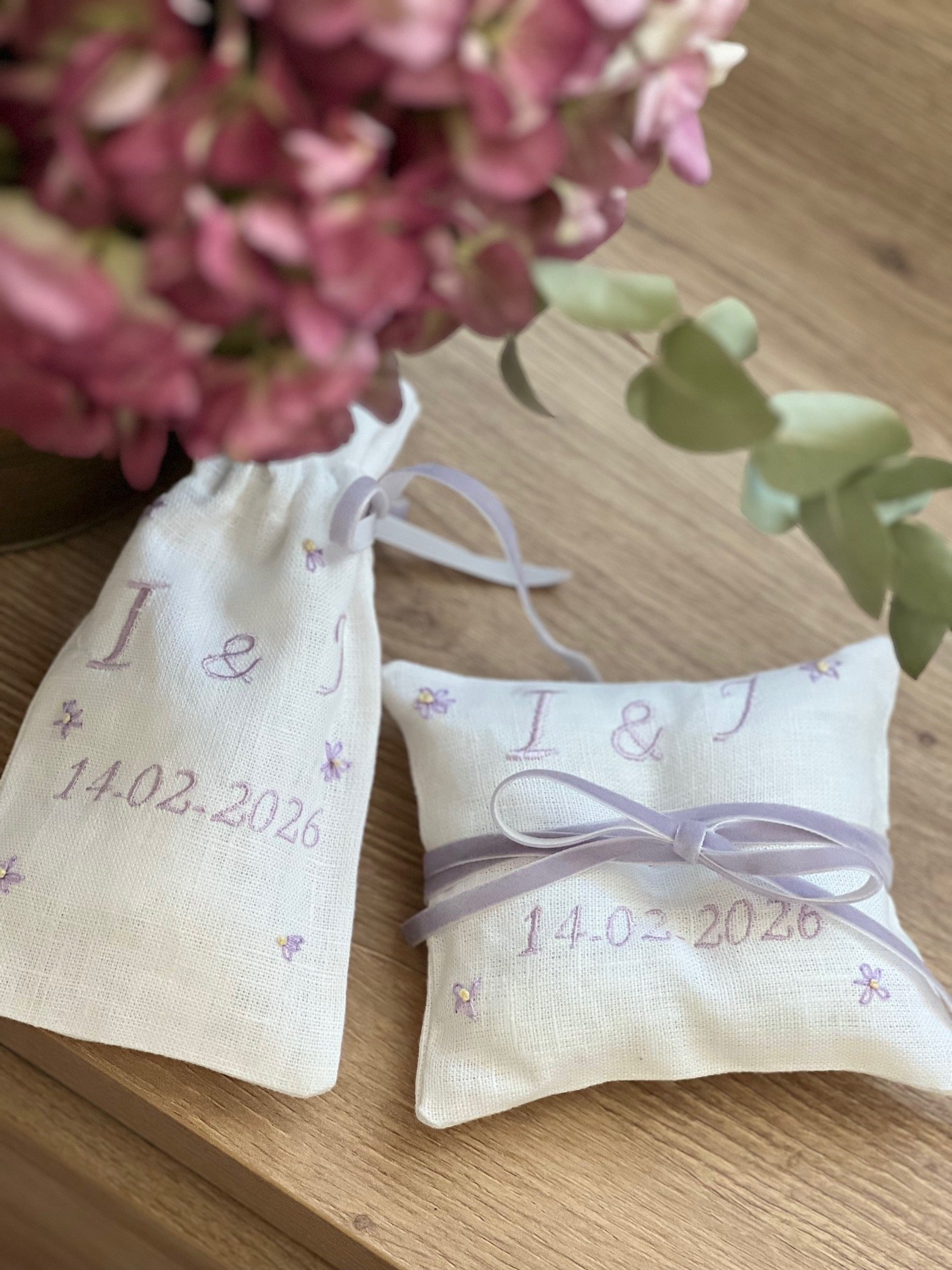 Pack Saquito bordado y cojín para alianzas personalizados rosa
