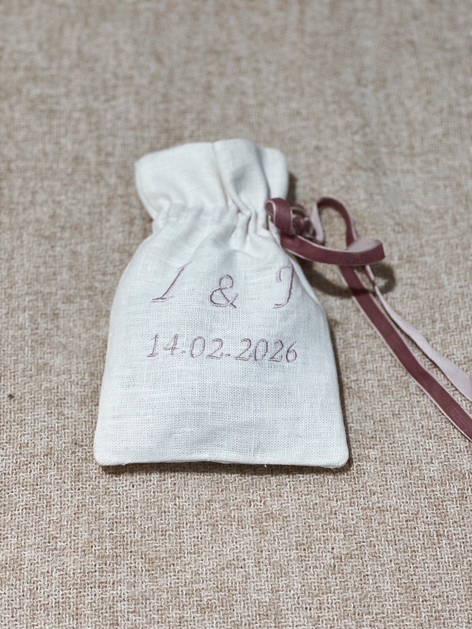 Fabricadas en fina tela de lino con delicados detalles bordados, y forradas en su interior con algodón suave, estas bolsitas son elegantes y duraderas, perfectas para resguardar las arras con cariño.